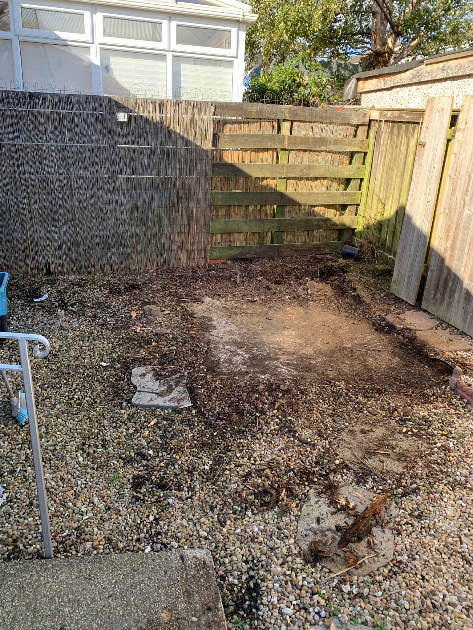 Before you start clear the area immediately surrounding so you have plenty of room to work without tripping hazards. Consider repurposing the materials if they are salvageable. For instance, there might be enough wood to build a bench or table.